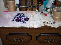 The dresser is an in between station where pieces get dropped while I think about how to proceed with a pattern or where they sit until I can mount them on my 3 foot square blocking board which is stored behind the cabinet. Small things can be blocked on the ironing board, but larger items, like doilies, hang off the edges so they need a bigger area. The bed makes a large surface at just the right height for holding the blocking board while I pin things out. So finished tatting often sits on the dresser until I have the time to block it. It gets thrown back on the corner of the dresser until it can be scanned or photographed and again until the pattern gets drawn out if I haven't done that first. It gets put back on the corner when it's done until I either give it away or find some place to store it. That's what this mixed stack of stuff is doing here.